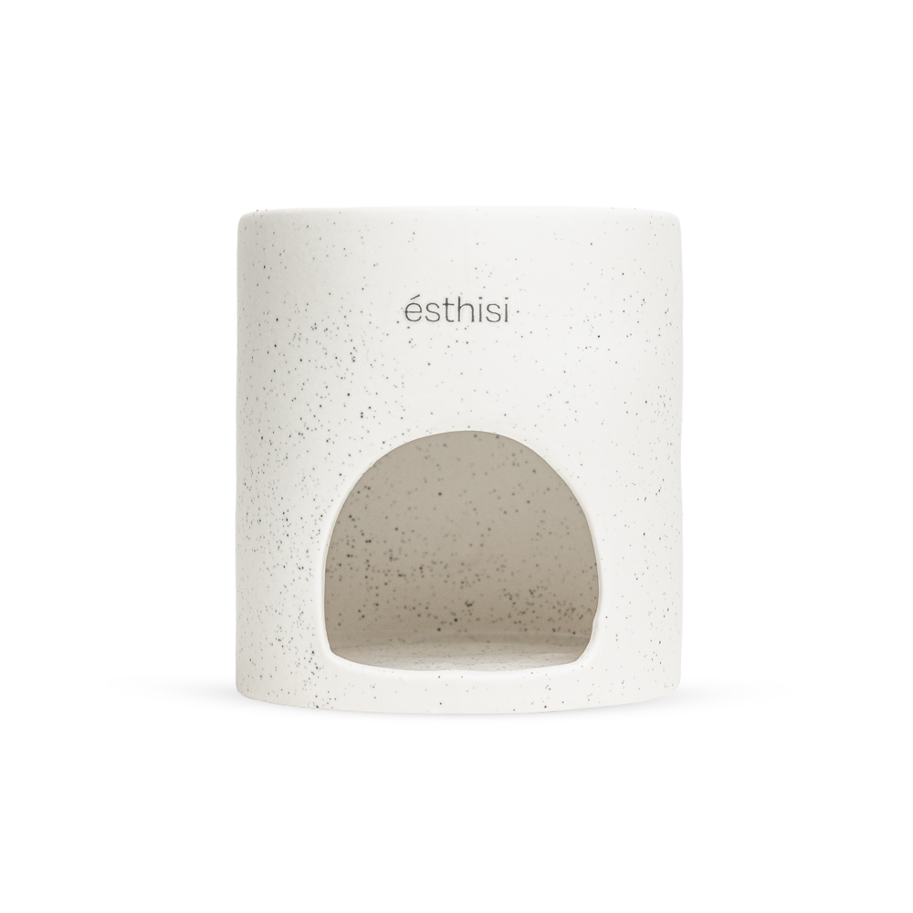 Εμπνευσμένο από το ηφαιστειακό τοπίο της Θήρας, το “Thira Stone” είναι κάτι περισσότερο από ένα wax melter. Είναι ένα αντικείμενο ήρεμης αρχιτεκτονικής και στοιχειακής ομορφιάς. Η απαλή λευκή του επιφάνεια, διάσπαρτη με διακριτικές σκούρες πινελιές, αντικατοπτρίζει την υφή της σαντορινιάς πέτρας, σμιλεμένης από τη φωτιά, τη θάλασσα και τον χρόνο. Το καμπύλο άνοιγμά του αντλεί έμπνευση από τις ήσυχες θύρες των κυκλαδίτικων σπιτιών, εκεί όπου το φως συναντά τη σκιά και η ζεστασιά κατοικεί στο εσωτερικό. Όταν ανάβει, η λάμψη που αναδύεται το μεταμορφώνει σε ένα μικρό καταφύγιο, έναν χώρο τελετουργίας όπου το άρωμα απελευθερώνεται απαλά και αγκαλιάζει τον χώρο με μια αίσθηση γαλήνης και ισορροπίας.