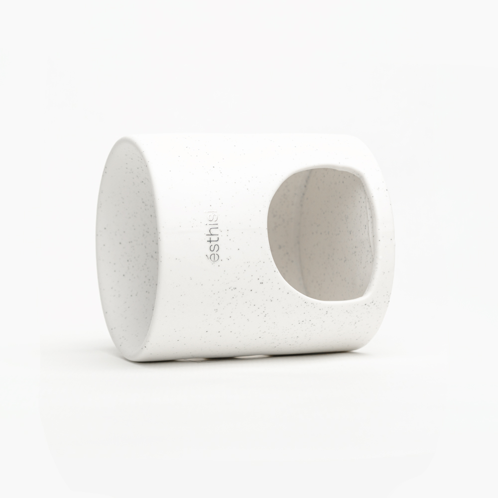 Εμπνευσμένο από το ηφαιστειακό τοπίο της Θήρας, το Thira Stone είναι κάτι περισσότερο από ένα wax melter. Είναι ένα αντικείμενο ήρεμης αρχιτεκτονικής και στοιχειακής ομορφιάς. Η απαλή λευκή του επιφάνεια, διάσπαρτη με διακριτικές σκούρες πινελιές, αντικατοπτρίζει την υφή της σαντορινιάς πέτρας, σμιλεμένης από τη φωτιά, τη θάλασσα και τον χρόνο. Το καμπύλο άνοιγμά του αντλεί έμπνευση από τις ήσυχες θύρες των κυκλαδίτικων σπιτιών, εκεί όπου το φως συναντά τη σκιά και η ζεστασιά κατοικεί στο εσωτερικό. Όταν ανάβει, η λάμψη που αναδύεται το μεταμορφώνει σε ένα μικρό καταφύγιο, έναν χώρο τελετουργίας όπου το άρωμα απελευθερώνεται απαλά και αγκαλιάζει τον χώρο με μια αίσθηση γαλήνης και ισορροπίας.